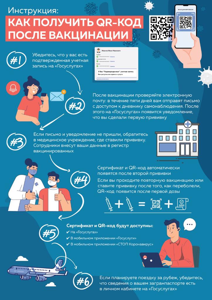 Министерство здравоохранения Российской Федерации разработало памятку с инструкцией по получению QR-кода после вакцинации от COVID-19. Ознакомиться с памяткой можно ниже.