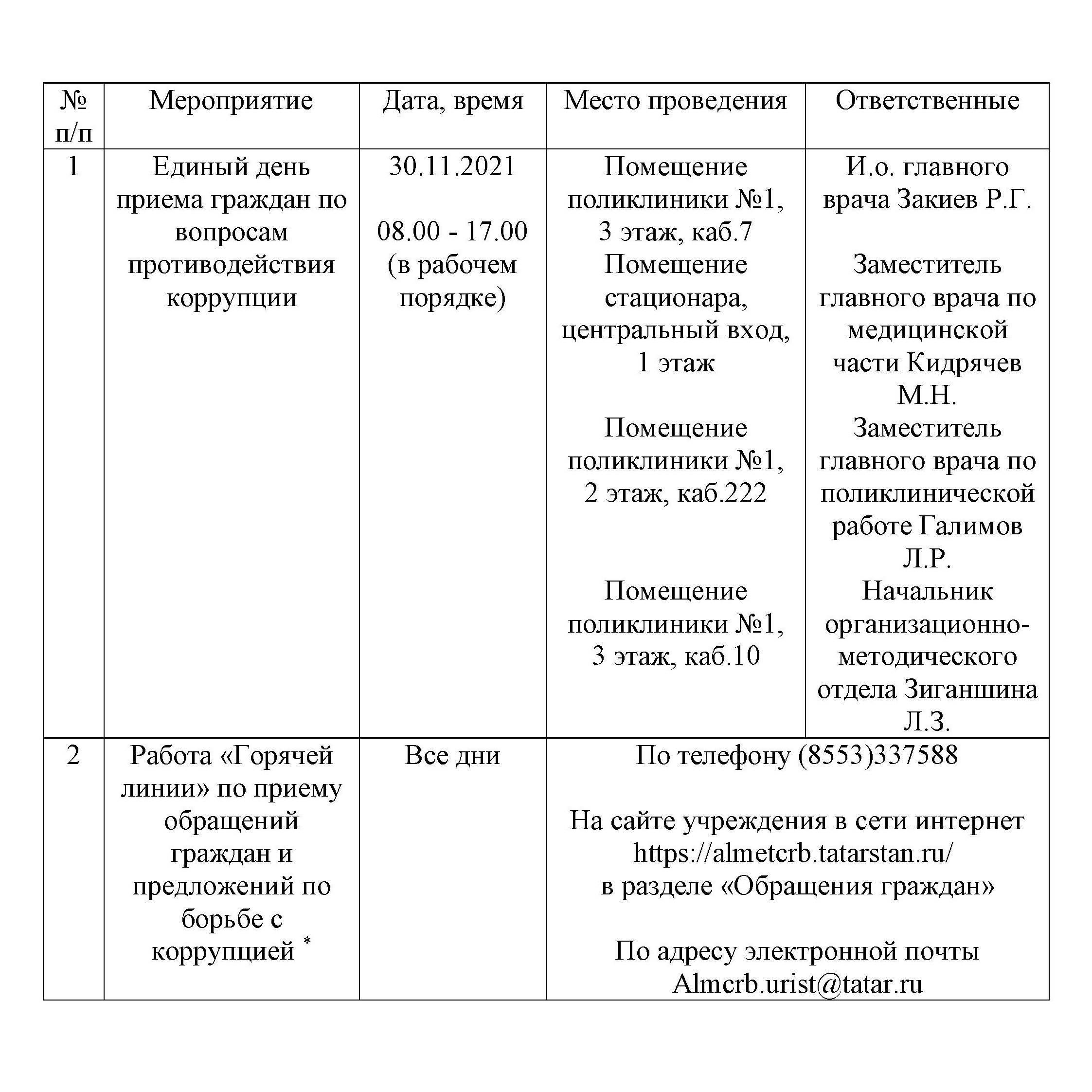 В период с 29.11.2021 по 03.12.2021, в рамках «Недели антикоррупционных инициатив», в ГАУЗ «Альметьевская ЦРБ» организуется проведение следующих мероприятий:
