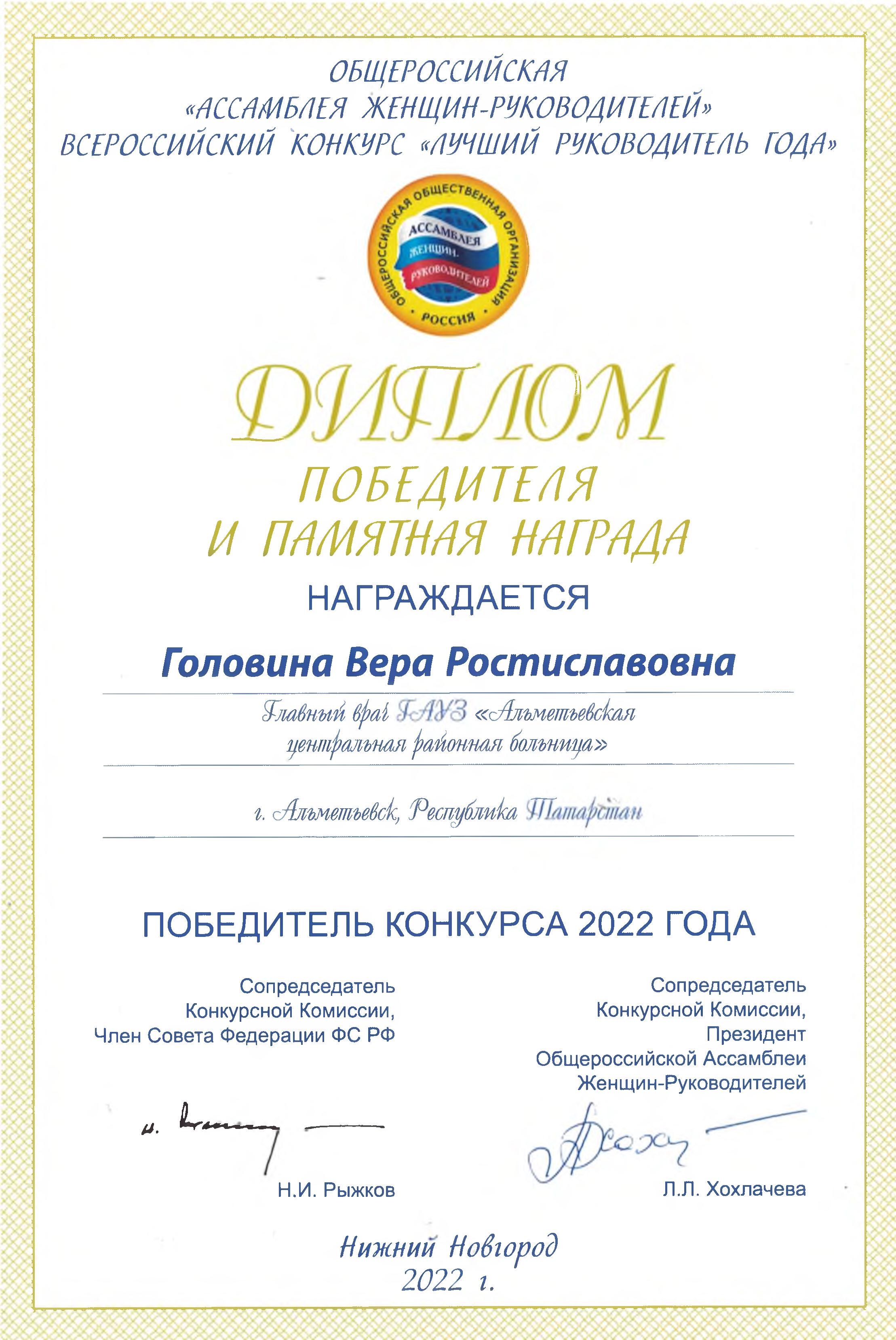Заслуженный врач Республики Татарстан, главный врач ГАУЗ «Альметьевская ЦРБ» Вера Головина стала победителем Всероссийского конкурса «Лучший руководитель года».