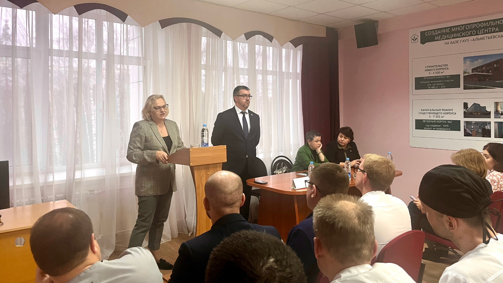 27 ноября 2025г. коллективу Альметьевской ЦРБ первый заместитель министра здравоохранения Республики Татарстан Елена Владимировна Демьянова представила нового главного врача — Алиуллина Алмаза Альфридовича. На церемонии также присутствовали заместитель главы Альметьевского муниципального района Роза Егоровна Афлятунова и главный врач ГАУЗ «АРМБ» Гульсина Анасовна Шамсеева. Представляя нового главного врача коллективу, Елена Владимировна отметила значительный вклад Алмаза Альфридовича в развитие регионального здравоохранения и выразила уверенность в его успешной работе на посту руководителя Альметьевской ЦРБ.