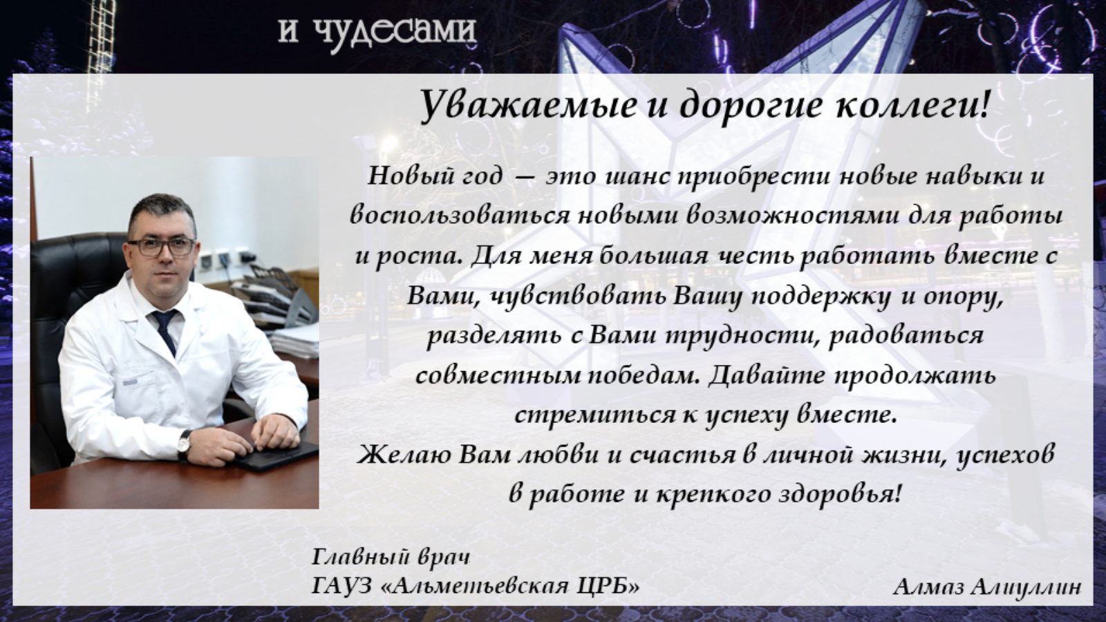 Главный врач Алмаз Альфридович Алиуллин поздравляет коллектив Альметьевской ЦРБ с наступающим Новым Годом.