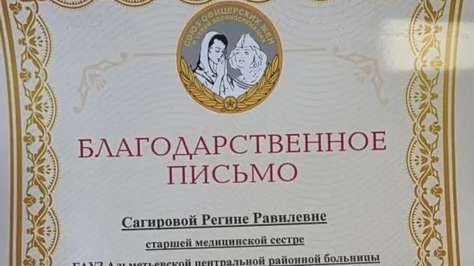 В Альметьевской центральной районной больнице трудятся сотрудники, чьи доброта и профессионализм вдохновляют коллег. "Союз офицерских жен" выражает признательность старшей медицинской сестре неврологического отделения Регине Сагировой и всему коллективу этого отделения за неоценимую помощь и поддержку, оказанные во время мероприятия, приуроченного ко Дню Матери.
