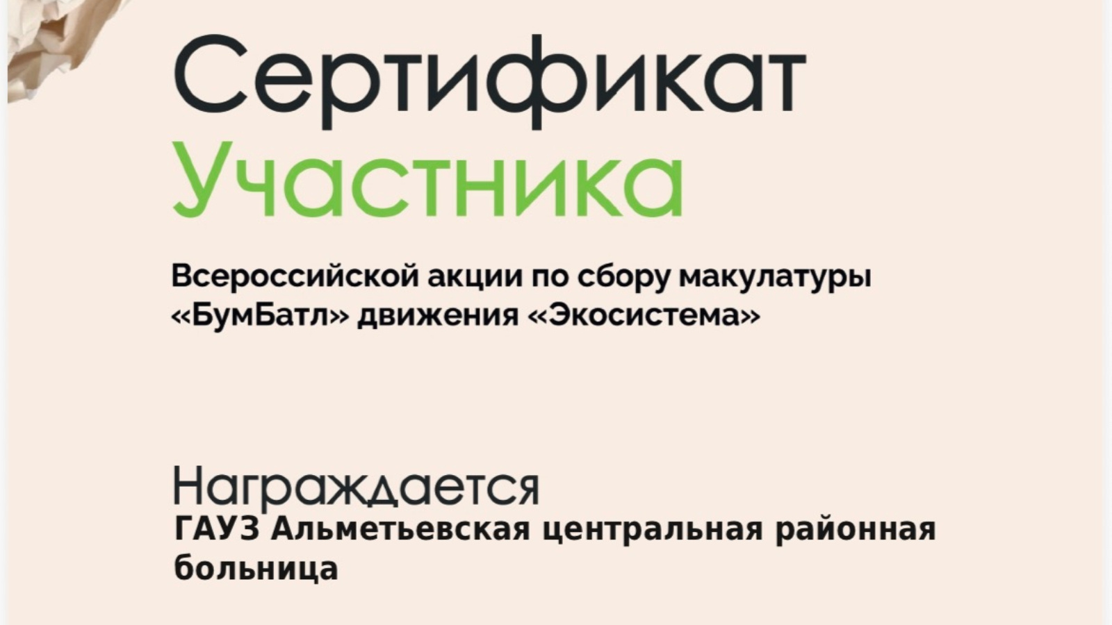 ГАУЗ «Альметьевская ЦРБ» была награждена сертификатом за активное участие в «БумБатле» движения «Экосистема»!